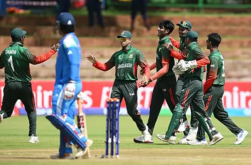 জিম্বাবুয়ের কুইন্স স্পোর্টস ক্লাব মাঠে আজ বৃষ্টির কারণে টস হতে কিছুটা দেরি হয়েছিল। টস জিতে বাংলাদেশ আগে ফিল্ডিং করার সিদ্ধান্ত নেয়। ম্যাচের শুরুতেই ভারতের ওপর ঝাঁপিয়ে পড়েন বোলাররা। বিশেষ করে আল ফাহাদ ছিলেন দুর্দান্ত। ইনিংসের ৩ নম্বর ওভারেই তিনি পরপর দুই বলে ভারতের অধিনায়কসহ ২ জনকে আউট করেন। এক সময় হ্যাটট্রিকের সুযোগও তৈরি হয়েছিল। ৫৩ রান তুলতেই ৩ উইকেট হারিয়ে চাপে পড়ে ভারত। এরপর ভারতের বৈভব সূর্যবংশী (৭২) ও অভিজ্ঞান কুন্ডু (৮০) মিলে দলকে টেনে তোলার চেষ্টা করেন।